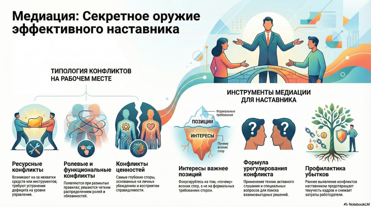 Вебинар был посвящен вопросам управления конфликтами и медиации в наставнических отношениях. Эксперт объяснила разницу между знаниями, навыками и способностями и обсудила различные типы конфликтов, включая конфликты ресурсов, ролевые конфликты и конфликты ценностей. Ирина подчеркнула важность понимания интересов, а не позиций в урегулировании конфликтов. Она поделилась формулой урегулирования конфликта и продемонстрировала, как использовать методы опроса для разрешения споров.